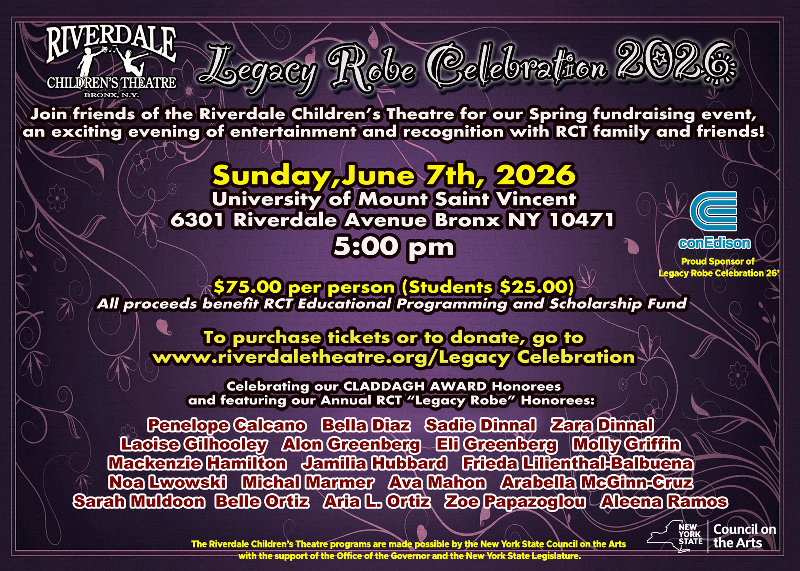 This spring, The Riverdale Children’s Theatre will be celebrating our Legacy Robe tradition with a fundraising concert June 7th, 2026.  It’s an evening of entertainment to celebrate our kids and raise funds for our programs and scholarships. Providing a first class arts program for families is an ongoing challenge and we need your help. We continue to try and keep our programs affordable and provide scholarships to families in need. Nearly a third of our families receive tuition assistance , and the pandemic has prevented us to operate at capacity for nearly 2 years. Your support and assistance is crucial for our organization to continue to offer quality programming.