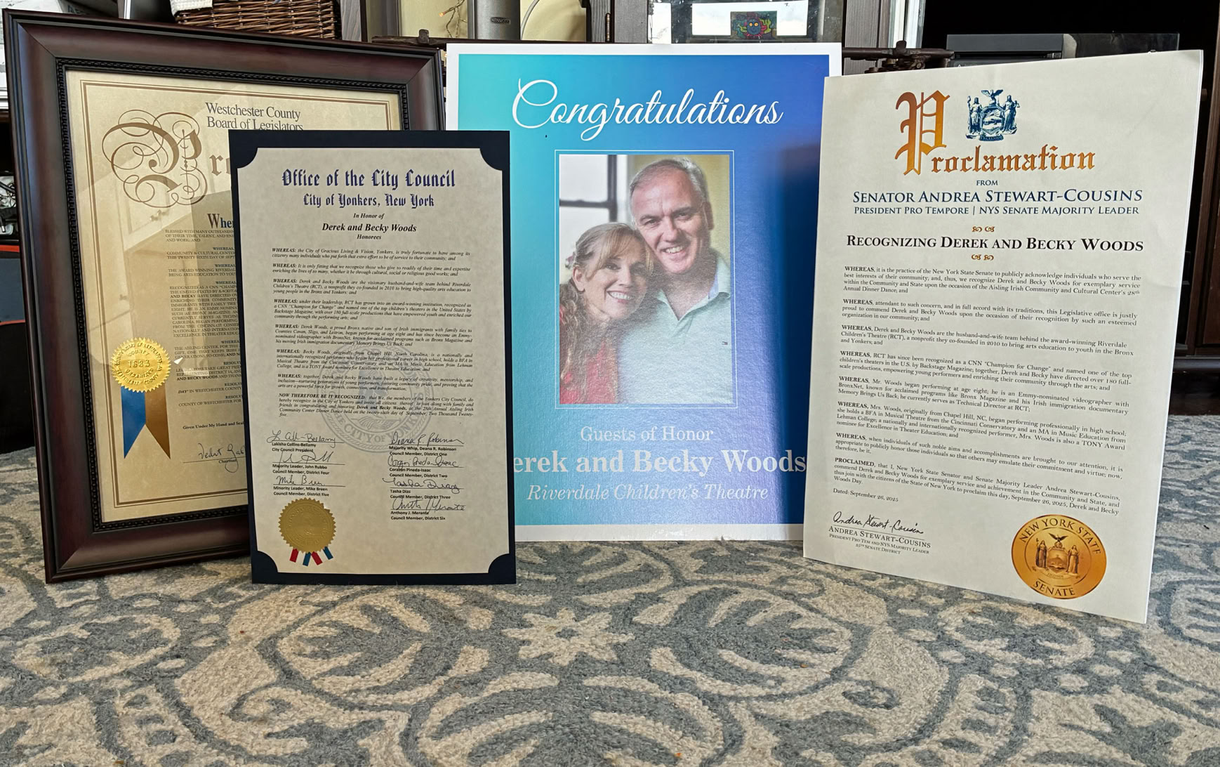 The 28th Annual Aisling Center Dinner Dance was held Friday, September 26th, honoring Darragh Garvey, partner of The MGF Group, Patrick K. Murphy, founder of New Logical Sports, and Derek and Becky Woods, founders of The Riverdale Children's Theatre. “Thank you all for joining the Aisling Center Dinner Dance as we celebrated our worthy honorees, Darragh Garvey, Patrick K. Murphy, and Derek & Becky Woods.” remarked Aisling Center Executive Director Sandra Feeney-Charles “ Our hearts are still full with all the warmth, excitement, and support received. We are deeply grateful for your unwavering support of the Aisling Center and the community we proudly serve. It was both an honor and a joy to celebrate your remarkable achievements and selfless contributions, and because of you, our neighborhood is a better, brighter place.” Many members of the RCT family , past and present, joined with staff members for the event. “This honor is shared by Becky and I with all of the tremendous kids, families and artists that bring the RCT mission to life” remarked Mr. Woods ”The Aisling Center is a vital hub of our Woodlawn community, and a beacon to the entire Irish - American Community. To be recognized by them for our work is truly extra special”