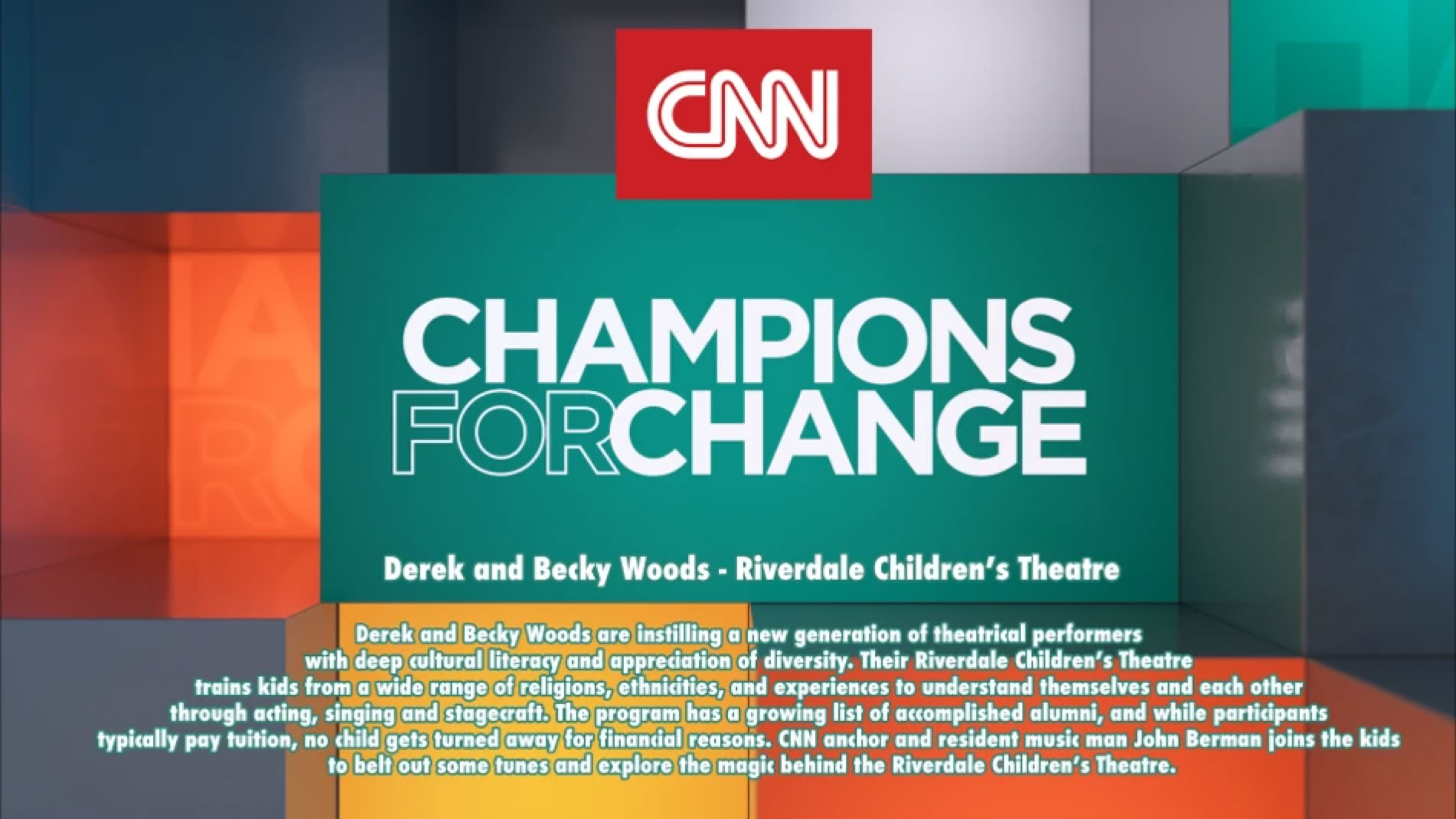 RCT produces full scale musical theatre productions, offers music and dance programs, and distributes thousands of dollars in scholarship each year so that any child can have access to their program. CNN’s special week-long event “Champions for Change” launches Sunday, September 19th across CNN, and culminates in a one-hour special hosted by Victor Blackwell and Alisyn Camerota on Saturday, September 25th at 8 pm ET/PT. To learn more about the Riverdale Children’s Theatre, log on to www.riverdaletheatre.org. To see the official CNN Press release: